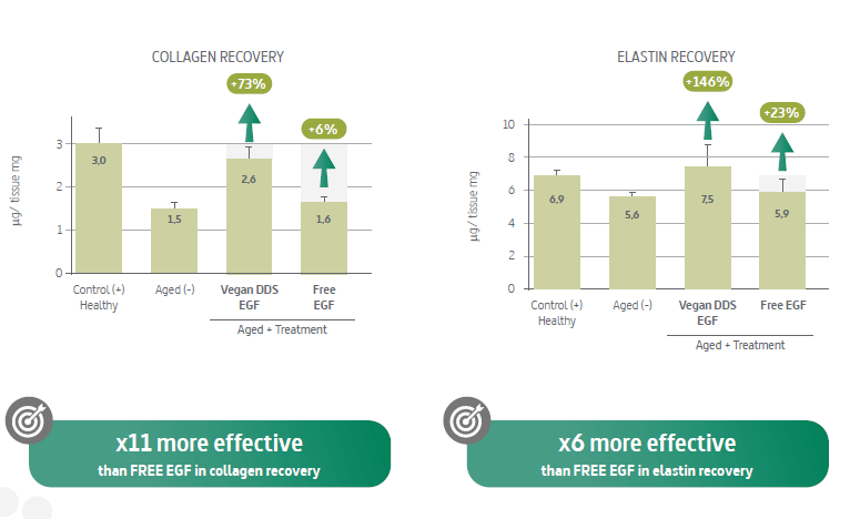 If you need performance-supporting evidence for internal alignment, INdermal also provides an ex vivo dataset using a human organotypic skin explant model comparing an encapsulated EGF gel to a free EGF gel at the same concentration, assessing collagen- and elastin-related outcomes via histological methods. It’s not a clinical trial, but it is a structured comparative approach that can help inform development decisions and support technical positioning during customer conversations.
