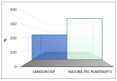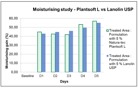 Moisturizing study over 5 days (supplier comparative test). Moisturizing properties of Natura-Tec Plantsoft™ L and Lanolin USP are reported as comparable, with both ingredients showing a cumulated effect of moisturizing gain in the supplier study.