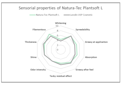 Sensorial profile comparison (supplier comparative test). Lanolin USP and Natura-Tec Plantsoft™ L were evaluated at 10% in an emulsion system, showing very similar sensorial characteristics across spreadability, shine, texture/thickness, and odor intensity.