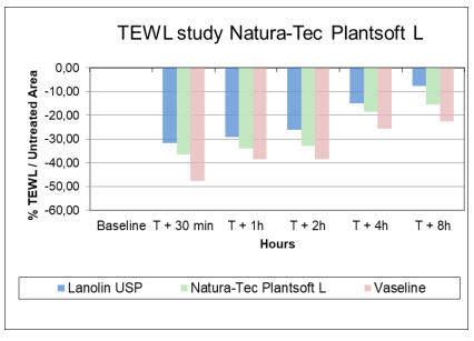 EWL study (supplier comparative test). The supplier reports Plantsoft™ L reduces TEWL more than Lanolin USP, but less than Vaseline, which is noted as occlusive.