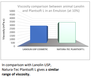 Plantsoft™ L is described as a vegetable base alternative to lanolin, with comparable viscosity range and similar sensorial characteristics in an emulsion system. Start matched, then tune.