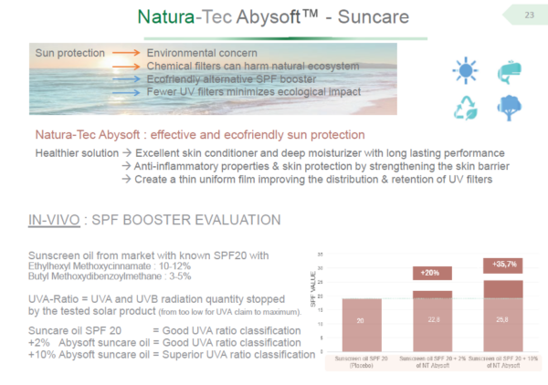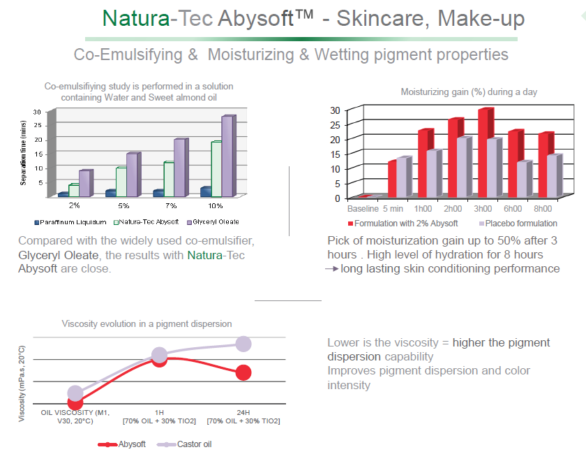 Abysoft is positioned as a multifunctional performance enhancer that can act as a sensorial agent + moisturizer + co-/self-emulsifier + pigment wetting agent + SPF booster.
